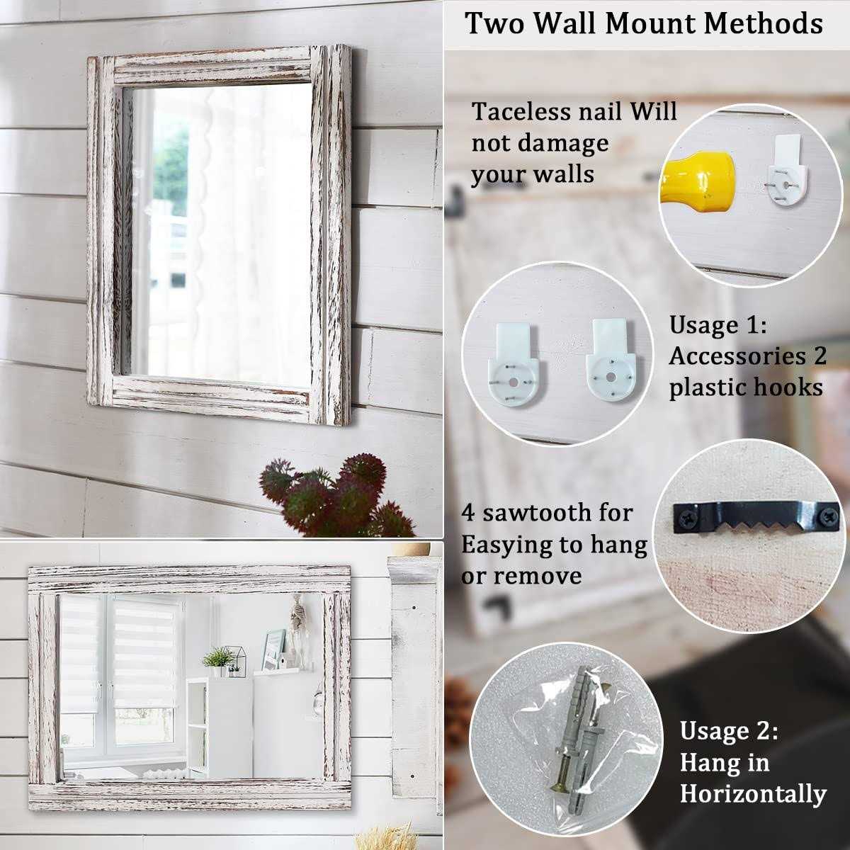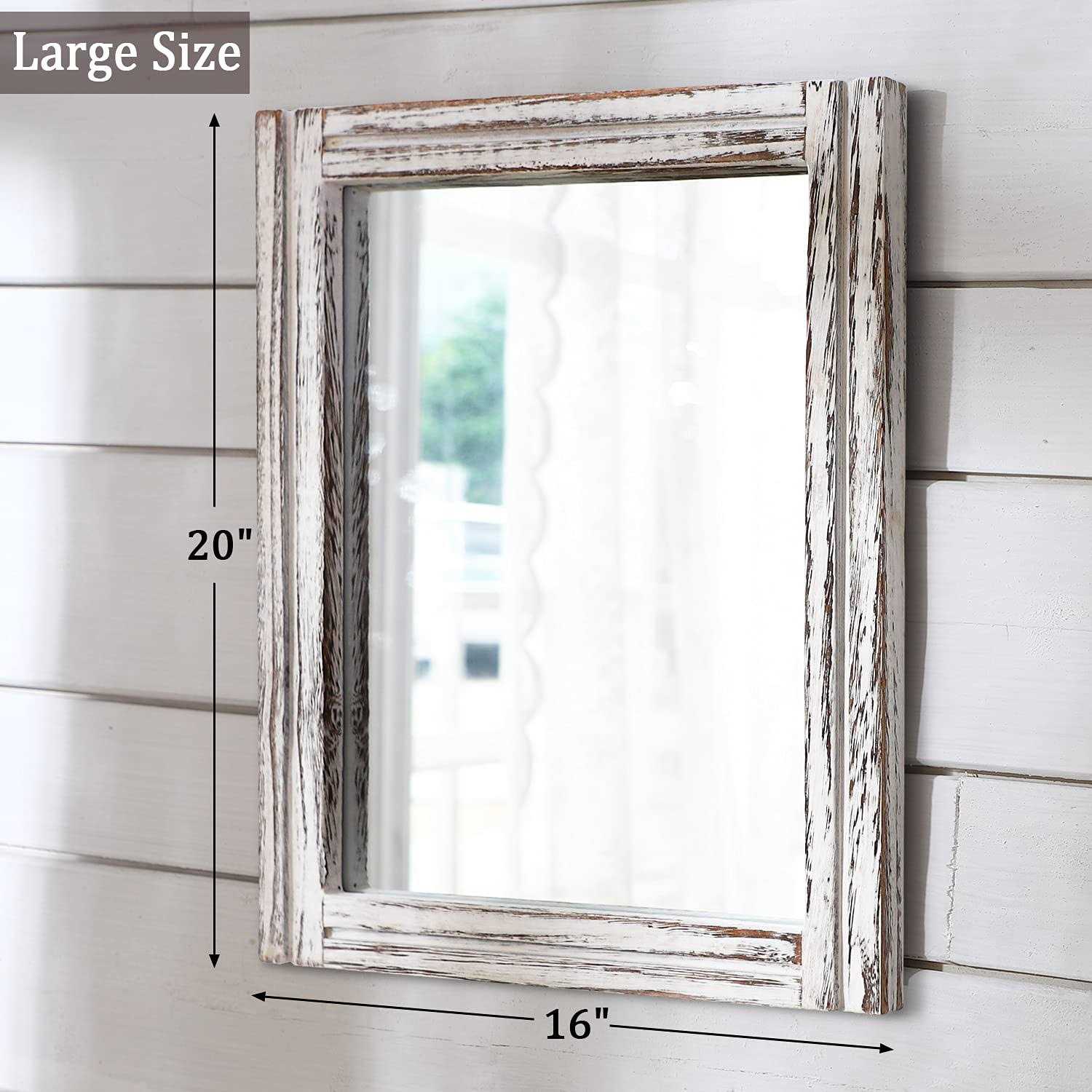 Stylish&Eye-Catching:Wooden border in rustic white color with subtle for a rustic touch. This farmhouse style wall hanging mirror can keep your space looking country-chic. Classy Design:This wood mirror has a rectangular shape that is perfect vertical on your wall depending on your decor. Sturdy&Durability:The glass mirror is secured and embedded in the frame and reinforced with solid backing for added stability. – Crafted of thick, strong metal. Easy to Install:Four saw tooth hanger are attached to the back,the package includes hardwares. – According to your needs,the wooden mirror can be mounted by vertical or horizontal. – It is very flexible to use. Large Size: 20″ length,16″ width,(reflection measurements 17.3″x13.4″) perfect addition and looks fabulous for any wall. – The size allows you to easily change its placement. Two Wall Mounted Methods br The design of the mirror is convenient and flexible to use. – It not only can be mounted by vertical,but also can be mounted by horizontal. br Four saw tooth hanger are attached to the back,the package includes hardwares. br br Rustic Retro Rectangular Mirror br Add a rectangular wood mirror to spice up your dresser or a console table,make a great decor for your home br Perfect for bathroom, living room, bedroom, office, and entryway. br br Modern Farmhouse Style br The modern farmhouse look of its design gives this mirror a warm casual feel – a style that goes with and complements most home decor. br br Great Gift br This retro wall mirror can make a beautiful gift idea for your beloved ones. br As a thoughtful birthday, or housewarming gift for friends and family. br Its shape and style make it suitable for any room of the house, office or store.