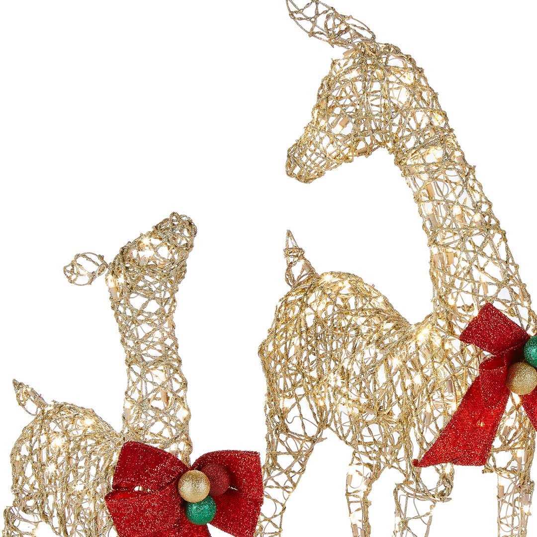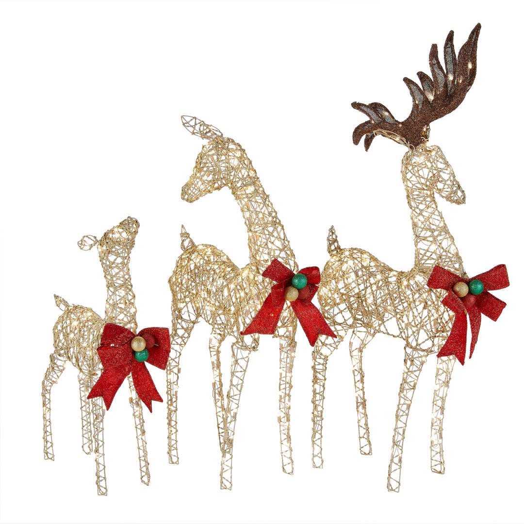 The 3 Piece Deer Family Assortment Set including mom, dad, and doe, are constructed of strong braided acrylic mesh that is sprinkled with glitter and wrapped around a sturdy wire frame. Each has a red ribbon and bow with ball ornaments as an attractive embellishment.