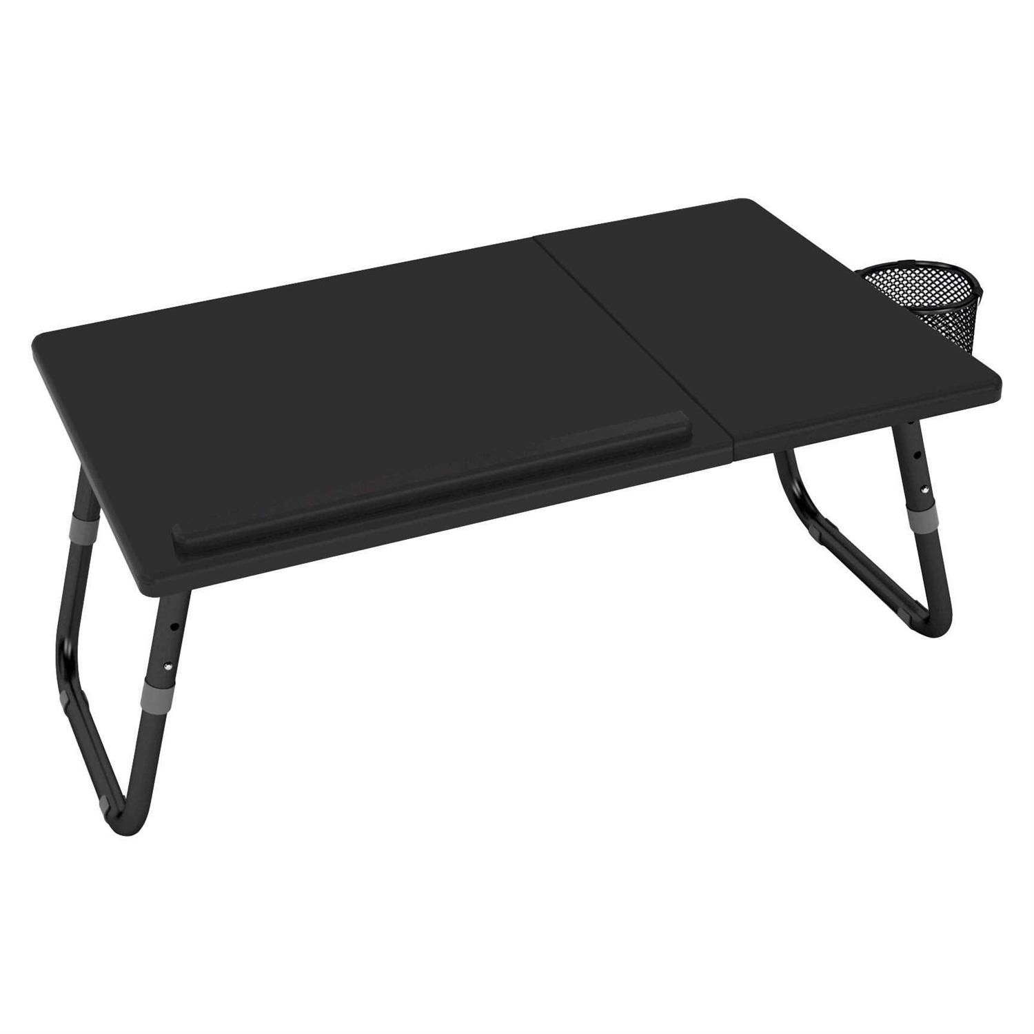 It is provided with side mounted cup holder hence avoids spilling of beverages on electronics. It can be tilted for comfortable working position and is featured with flat side platform to accommodate a mouse. 4 different angle positions for main top with stopper. Dimensions: 2 inch x 24.1 inch x 14.1 inch.