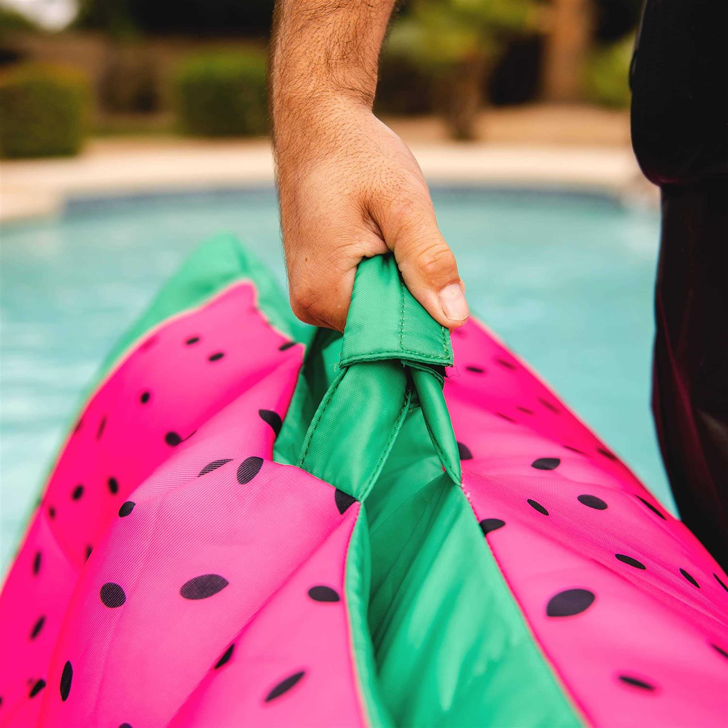 The Lagoon Lounger measures approximately 63″W x 43″D x 7″H and weighs about 5 lb. This float is covered in a quick-drying mesh fabric in vibrant colors and prints. You’re sure to find the perfect one for you! Save your breath! Our floats are filled with patented beans for all the buoyancy you’ll need. Refill beans sold separately. Designed for extra relaxation, recline back or sit upright, the choice is yours! When the party is over traveling is easy with its built-in on-the-go handle. This float is designed for pool use only and is not suitable for use in lakes, rivers, oceans, etc. Drain and dry before storage.