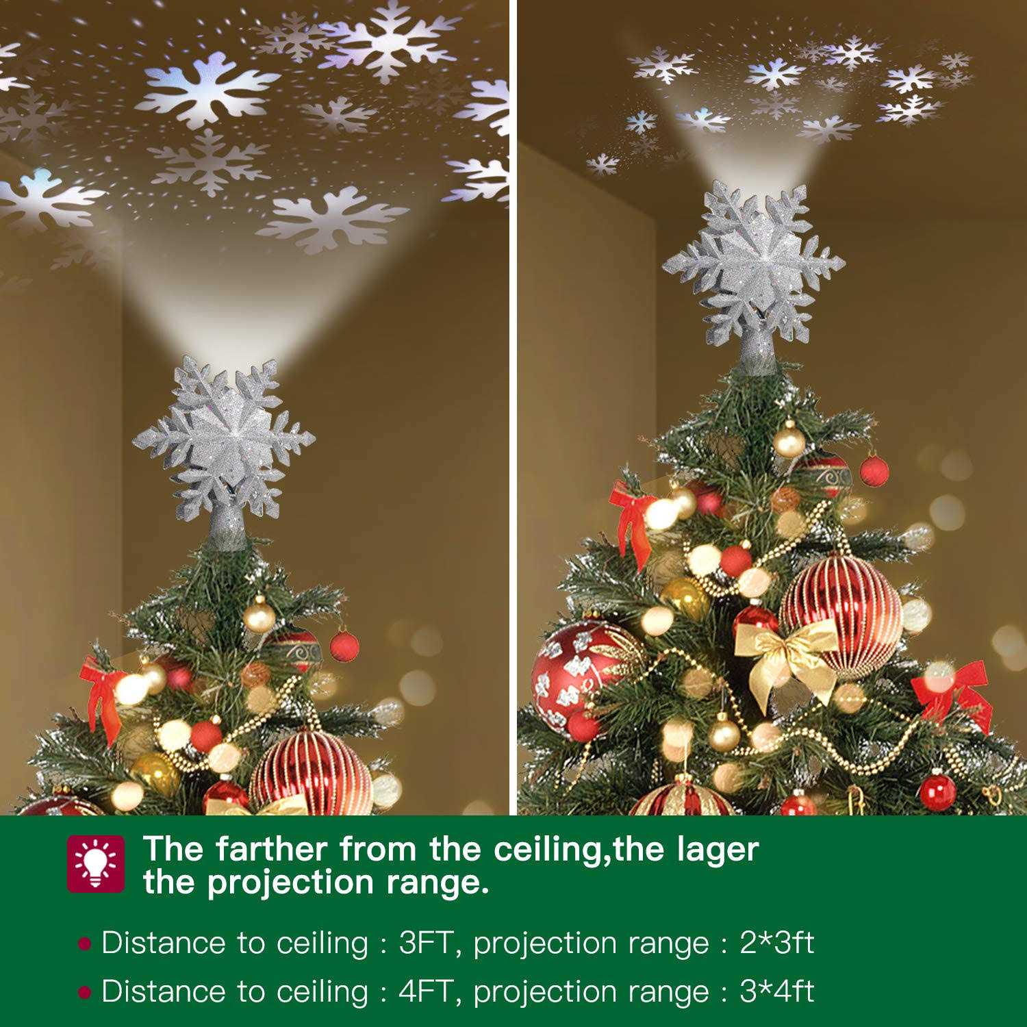 Universal Size: The Christmas Snowflake tree topper measures 9.8in(h) x 9.4in(l) x 1.8in(d), ideal for all kinds of different sized Christmas trees. The 9.2ft plug wire also enough to make the snowflakes tree topper easy to connect, perfect Christmas tree decorations. Advanced Design: This snowflakes tree topper features 3d hollow-out design with sparkling gold powder. Create magic and shining snowflakes for the top of your Christmas tree. Built-in snowflake projector, project high-definition snowflakes and perfect dynamic patterns. It’s peaceful snowflakes gently rolling across the ceiling sets a tone in the room perfect for the Christmas season. Easy to Decorate: Just install the base of the topper on the top of the Christmas tree and adjust to the right angle. Then plug in the power switch, the projector will show the fantastic and dynamic snowflakes on the ceiling. Best Christmas Decoration: The snow-colored shell that is sprinkled with gold glitter can be seen clearly at night, and it shines even under the illumination of the light. The snowflake is completely covered in silver glitter on both sides and is equally pretty front and back. Snowflake projection tree top lights and your Christmas tree are more perfect, making your Christmas tree more warmer in winter.