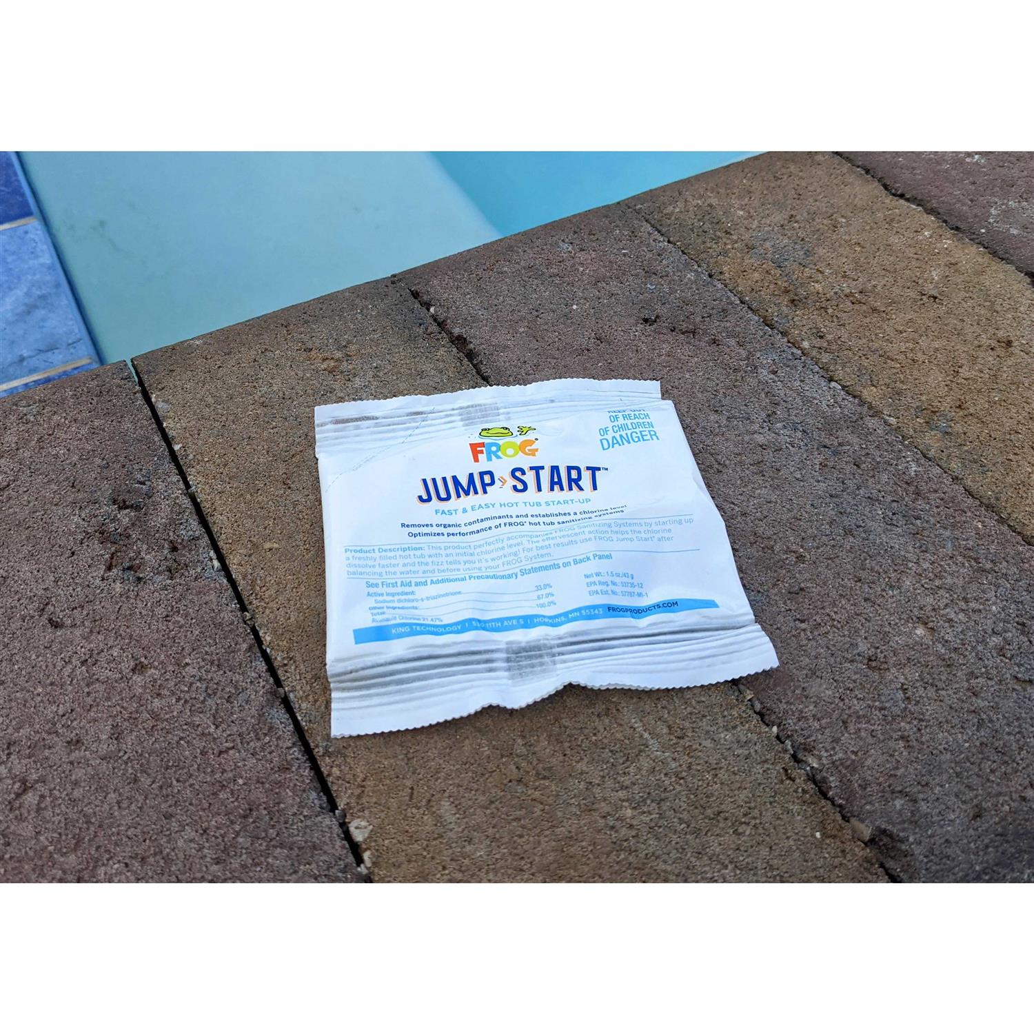One packet works in spas up to 500 gallons. The effervescent actio helps the chlorine dissolve faster The fizz tells you it’s working! Jump Start perfectly accompanies the Spa Frog In-Line System This product perfectly accompanies the Spa Frog Floating System or In-Line System by starting up a freshly filled spa with an initial chlorine level. The effervescent action helps the chlorine dissolve faster and the fizz tells you it’s working! For best results use Frog Jump Start after balancing the water and before using your Spa Frog System.