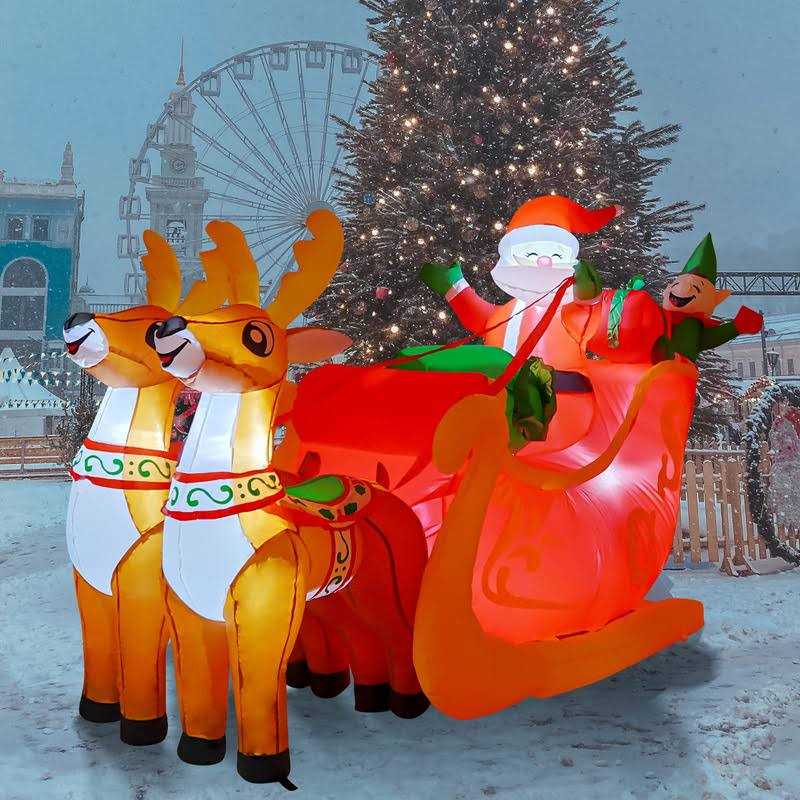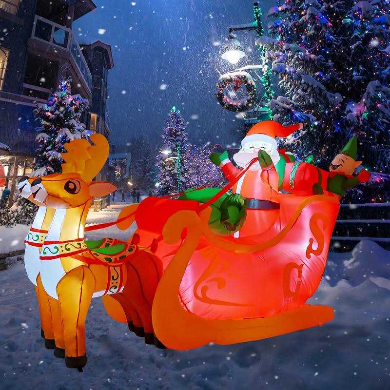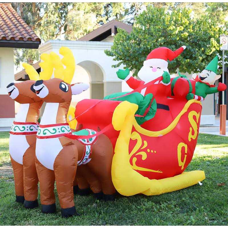 A happy Christmas party needs such a delicate christmas decorations santa sleigh inflatable! This santa sleigh outdoor christmas decorations are made of high strength waterproof polyester, which is against rips and tears. The excellent stitching improves the durability of the santa sleigh and reindeer outdoor decoration. In addition, the santa and sleigh with reindeer is providing with a powerful blower to continuous airflow inflate the santa sleigh and reindeer, it also comes with a storage bag for you to easily use in anywhere you like to set. The blower with a 10FT power cord which meaning that you can place this inflatable santa sleigh anywhere in your yard or garden. No worries any more about if the outdoor christmas decorations might fly away by the wind or not.