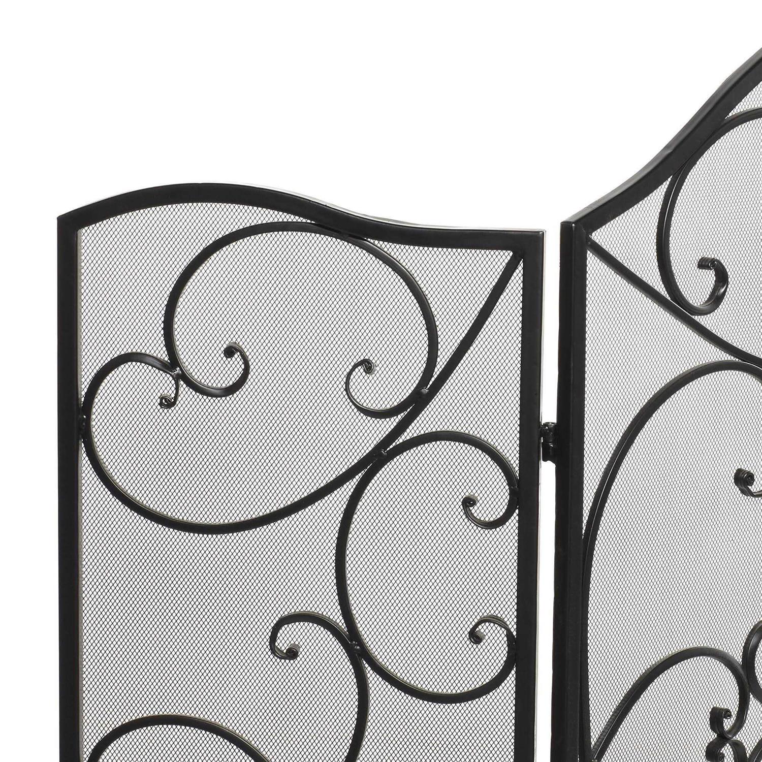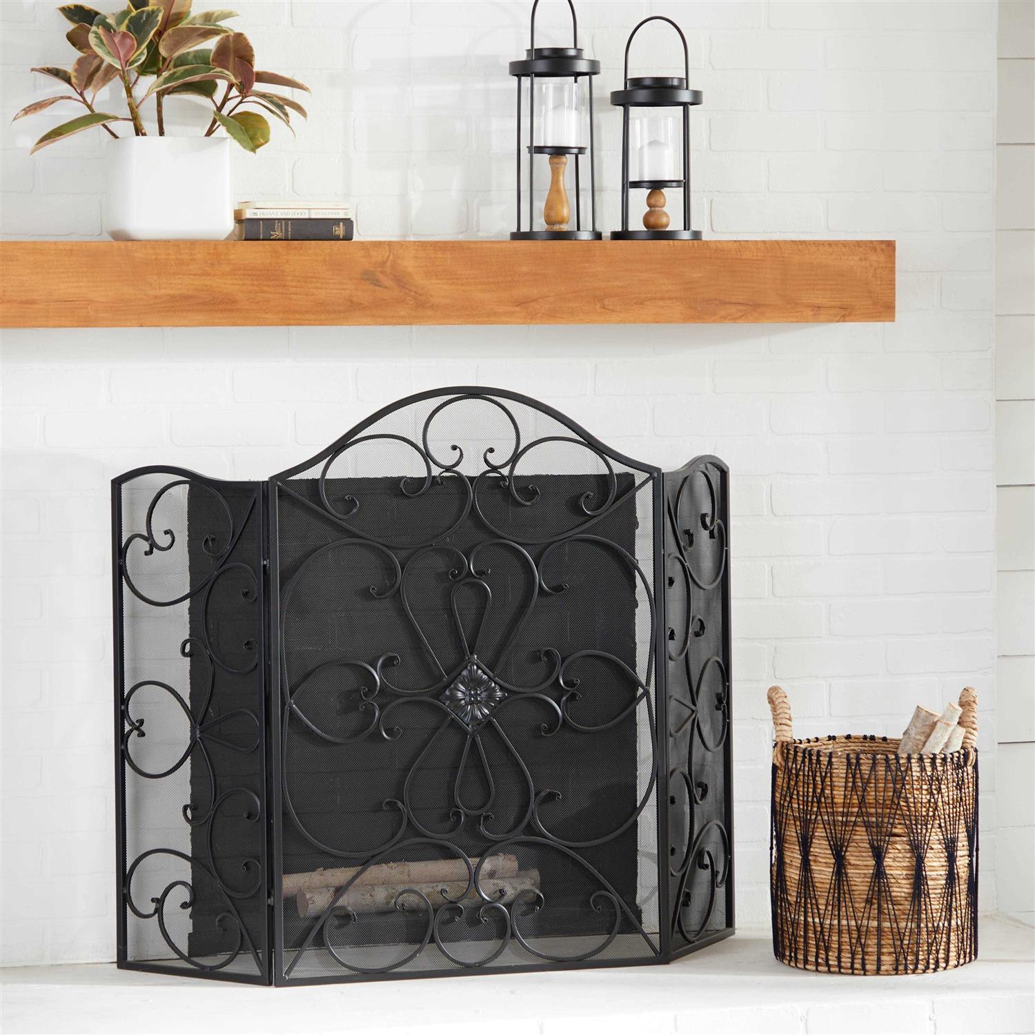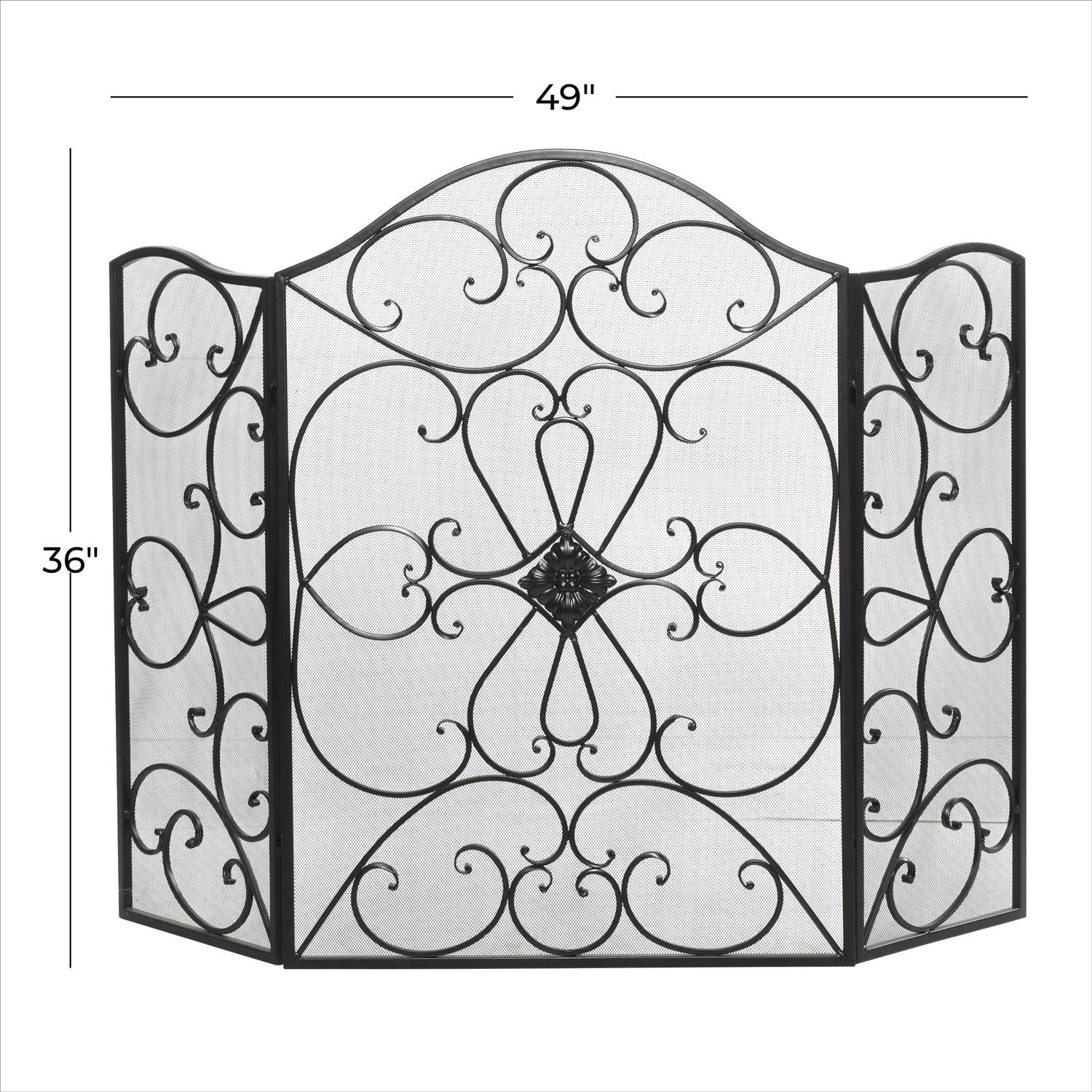 Grayson Lane Black Metal Foldable 3 Panel Scroll Fireplace Screen with Mesh Netting