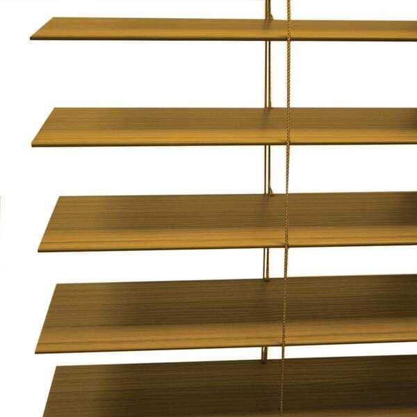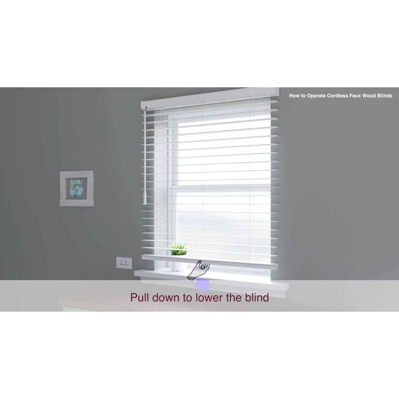 Cordless faux wood blinds add a cleaner look and are safer for children and pets. These premium faux wood blinds are designed with 25% larger slats for a greater outside view. Specially designed “no-hole” slats offer total light and privacy control. Room darkening slats are made from heat and moisture resistant material that is energy and cost efficient.These premium faux wood blinds are ideally used for bathrooms, kitchens and garages. For maximum light and privacy control, rotate the slats downward to ensure proper closure. Color: Chestnut.