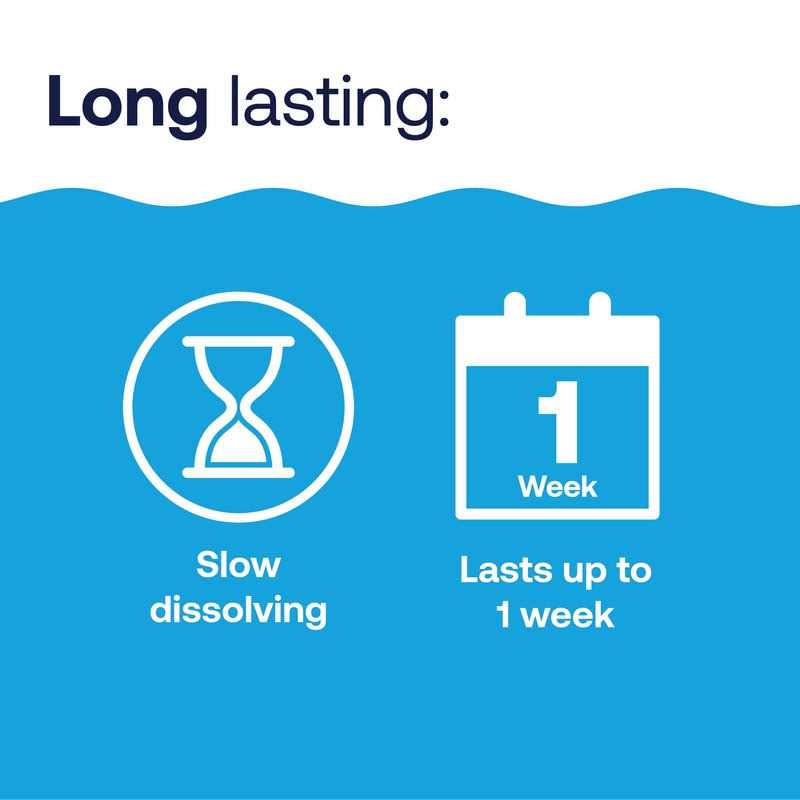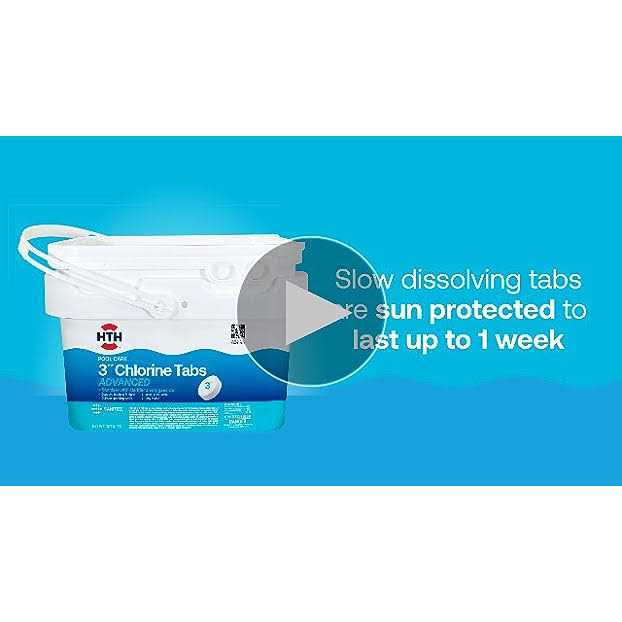 Chlorine by HTH. Details:Description The HTH 3″ Individually Wrapped Chlorine Tabs Advanced are a game-changer for pool owners who want to keep their pool water crystal clear and healthy for swimmers. With one easy and convenient tablet, you get a sanitizer, clarifier, and algaecide, protecting your pool and swimmers. This advanced formula is designed to sanitize, clarify, and kill algae for beautiful and clean water all season long. The slow-dissolving, long-lasting formula is sun-protected for longer chlorine life, dissolving slowly and lasting up to one week. These tabs are compatible with all pool types, including vinyl-lined pools and saltwater systems, and can be used in a floater, feeder, or skimmer basket. For best results, use HTH 6-Way Test Strips twice weekly to test and balance your swimming pool water and keep chlorine levels between 1 and 4 ppm. With HTH, you’re all clear!