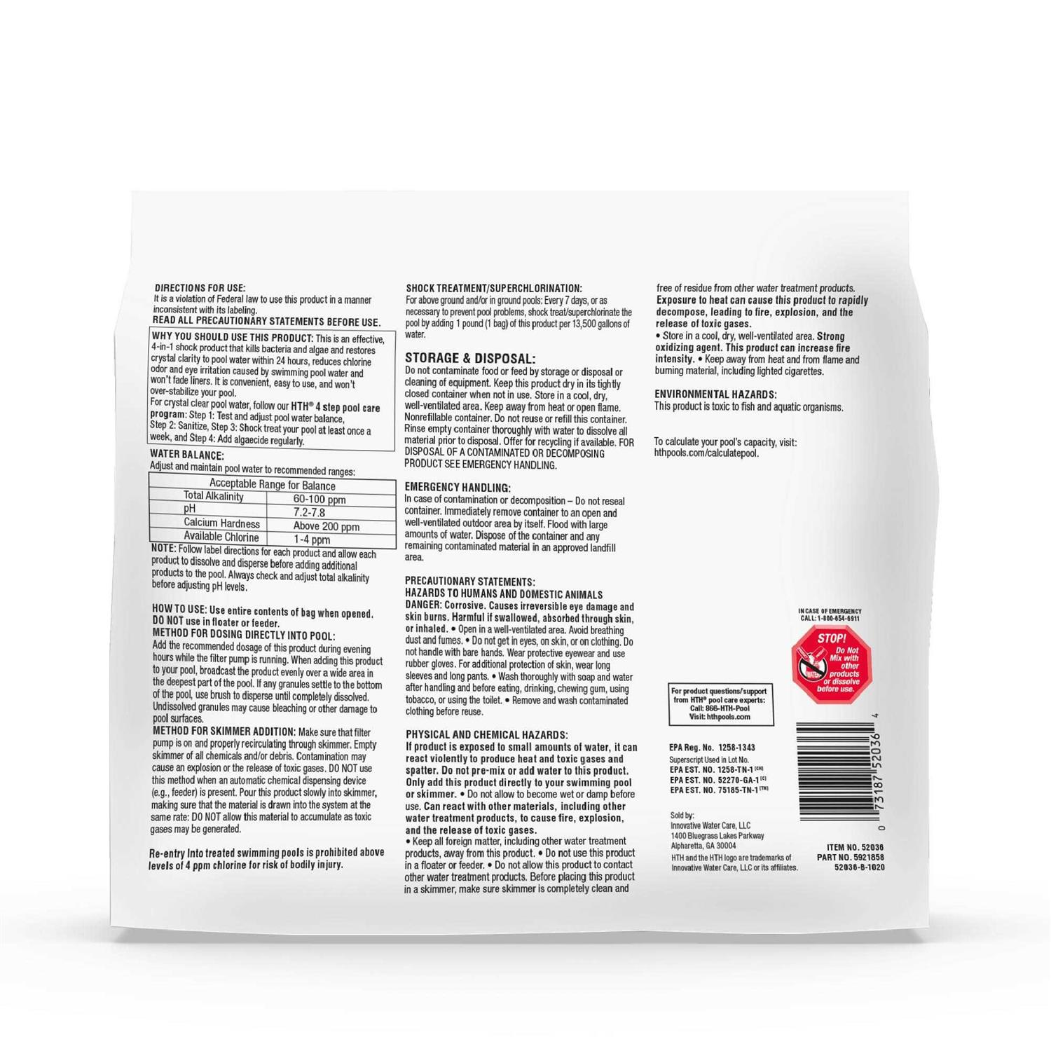 HTH Shock Advanced is the powerful 4-in-1 formula with Cal Hypo that kills and prevents bacteria and algae as well as reduces chlorine odor and irritation for crystal clear, healthy water. Traditional chlorine products contain cyanuric acid (CYA). When too much CYA builds up, it can cause overstabilization or chlorine lock and cloud your water. The fast-acting, fast-dissolving Cal Hypo formula in HTH Shock Advanced provides chlorination without adding extra CYA for a beautiful sparkle all season. This product is great for all pool types and won’t fade your pool liner.