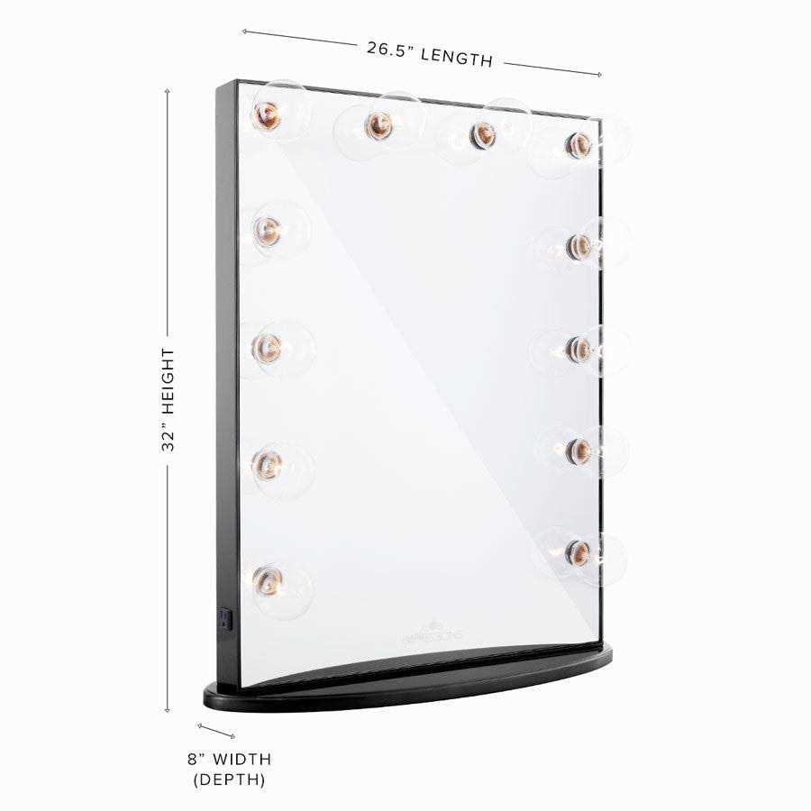 Overview The industry-leading bestselling Impressions Vanity Hollywood Glow XL Vanity Mirror is the perfect size and layout for vanity stations. The Hollywood Glow XL’s versatility is only matched by its flawless lighting prowess, inspiring elegance and innovative one-of-a-kind modern Hollywood design. The exclusive patented Impressions Vanity Hollywood Glow Frame design is unmatched in its simple sophistication Hollywood-style lighting is timeless aesthetic that provides perfectly even studio-quality illumination Upgrade to our custom premium LED vanity bulbs for daylight bright white lighting that renders more accurate colors, saves up to 90% energy, and lasts 25 times longer – a smart investment that actually saves you money in the long run No more ugly extension cords! Side-mounted accessory power and dual USB charging outlets for all your beauty accessories and device charging needs Lighting always on fleek with the easy-to-reach dimmer switch for quick and accurate lighting control Beautifully handcrafted with high-quality wood variations that lends to premium feel, weight, and quality Available in our signature Glossy White, Pro Black, Shimmery Silver, Champagne Gold, and Rose Gold premium finishes Detachable base for easy wall mounting (wall mount kit required, sold separately) Minimal assembly required, just screw in the base and bulbs, plug in, and light up! Our flagship line, the bestselling Impressions Vanity Hollywood Glow Series is designed from start to finish and beautifully hand crafted using high-quality materials. Every step performed by top craftsmen within our high-standard facility, our Hollywood Glow Series is masterfully created with signature finishes and glazed with the perfect touch of gloss. Truly an ultimate statement in vanity elegance, our exclusive patented Hollywood Glow Frame design strikes the perfect balance between luxurious classic and ultra-chic modern, birthing a new brand of Hollywood glamour and simple sophistication that has countless makeup lovers, pros and beauty bloggers falling in love. Join thousands of happy owners today and make your every makeup session an ethereal pleasure you’ll fall in love with each and every time! Tag @ImpressionsVanity on Instagram with the hashtag #ImpressionsVanityGlow to submit your photo for a chance feature on our pages! Dimensions Mirror: 23.25 x 31 in. Length: 26.5 in. Width: 8 in. Height: 32 in. Weight: 39 lbs. Bulb Types The main difference between our available incandescent and LED bulbs are the color temperature (glow color). Our incandescent bulbs have a warmer (more yellow) glow while LEDs have a more natural, whiter light as shown in the image* below: *computer rendered approximation, actual appearance may slightly differ LED bulbs also are energy-saving and do not get hot to the touch, unlike traditional incandescent bulbs.