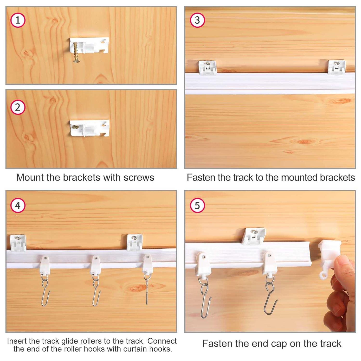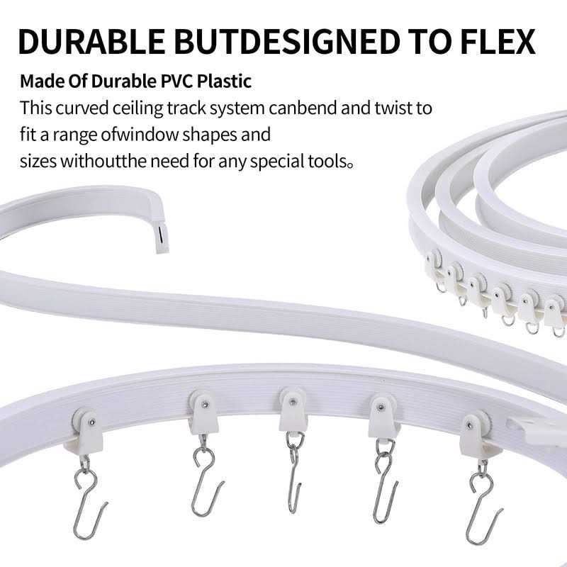 Ceiling curtain track can be cut down to specific size using a tooth hacksaw and easily combines with another tracks; Curtain track ceiling mount can bend and twist to fit a range of window shapes and sizes, not easy to crack or break. CURVED CURTAIN TRACK Curtain track rail, open and close your curtains with ease; smooth and provide easy and private life; Mounted track rollers on the surface of sliding curtain track system reduces the noise users make when sliding. How to use 1. The curtain rail is rolled up, straighten the rails. 2. Use the provided anchors (if it is drywall) to install the brackets and tighten them about 10 to 12 inches apart. For tight bends, add additional brackets as needed. 3. Attach the end cap to one end of the curtain rail. Slide the track rollers onto the rail. 4. Snap the curtain rail into the installed ceiling bracket. Package Includes 1 x 5m(16.4 FT) Flexible Curtain Track 40 x Track Rollers 40 x Iron Curtain Hooks 15 x Snap-on Ceiling Brackets 4 x End Covers