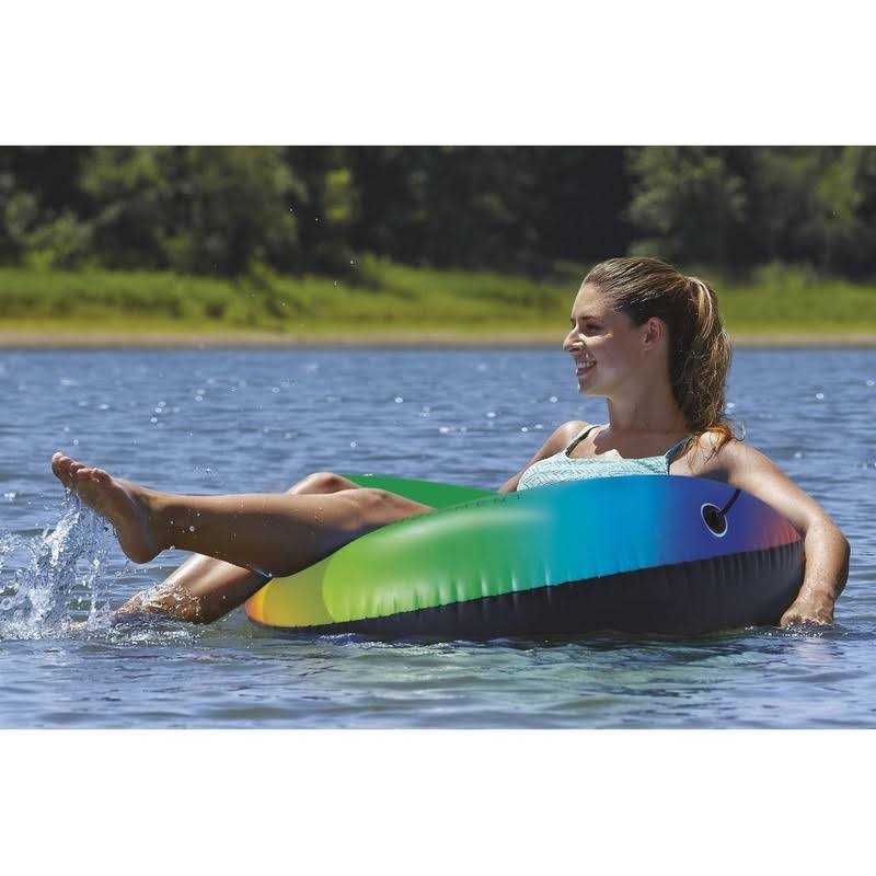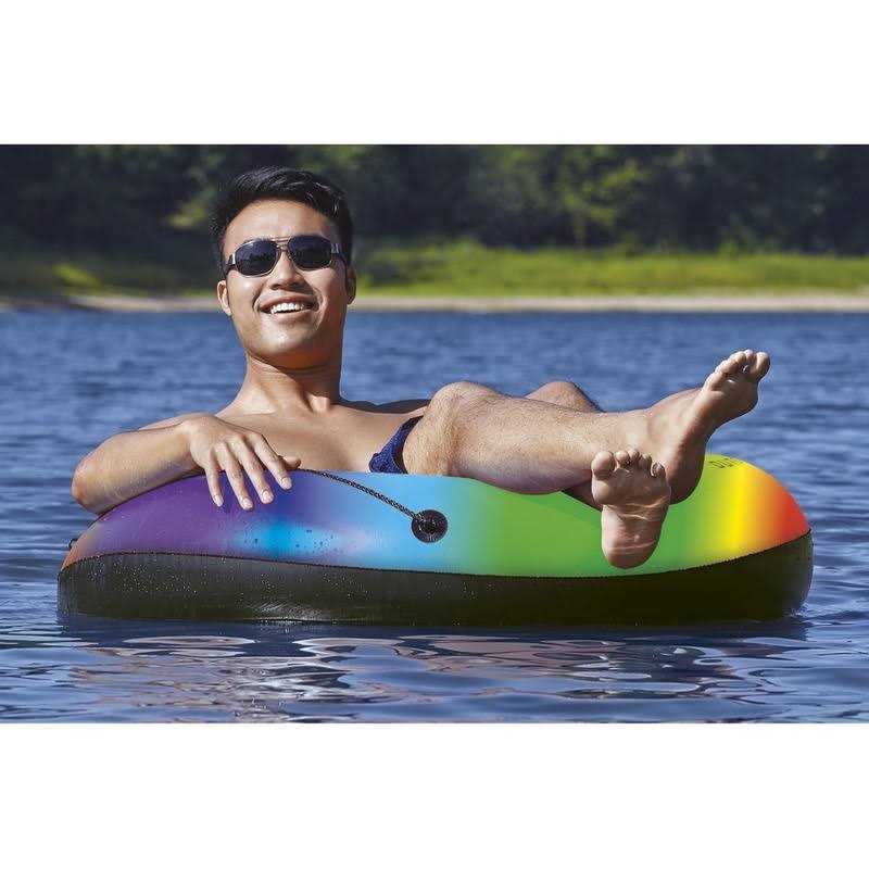 Float down the river in style with the Ozark Trail Unisex Rainbow River Tube! The cool rainbow color gives this tube an extra splash of personality. Constructed with specialized Inflata-Shield material, this tube resists puncture, limits stretching and enhances grip. The grab rope makes it easy to transport down to the water and easily get back into the tube if you go for a swim. Easy to inflate, deflate and store, this Ozark Trail Adult Rainbow River Tube makes hitting the water easier than ever before!