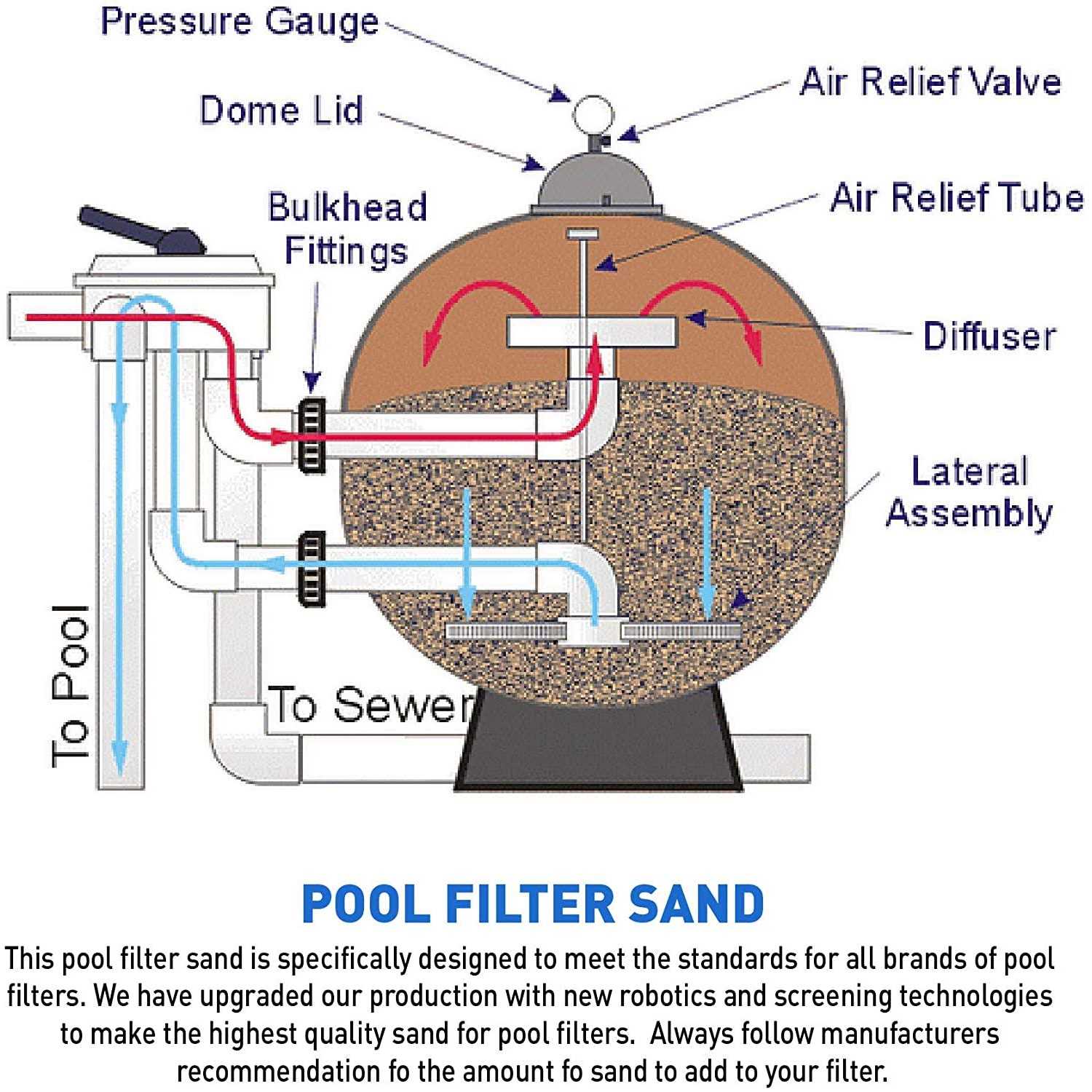 Our perfectly sized pool filter sand filters out insects, leaves, dirt, dust, sunscreen oild, hair and other small particles to keep your pool sparkling clean. This pool filter sand is specifically designed to meet the standards for all brands of pool filters. Always follow manufacturers recommendation fo the amount fo sand to add to your filter. Our sand is 100% natural and has no chemicals added. This ensures smooth operation for backwashes. Our sand will not solidify not allowing clogging and channeling of the sand in the filter. Our sand exceeds the requirements of the American Water Works Association for pool filter sand and our sand is packaged in strong heat sealed 6.5 heavy mil bag.