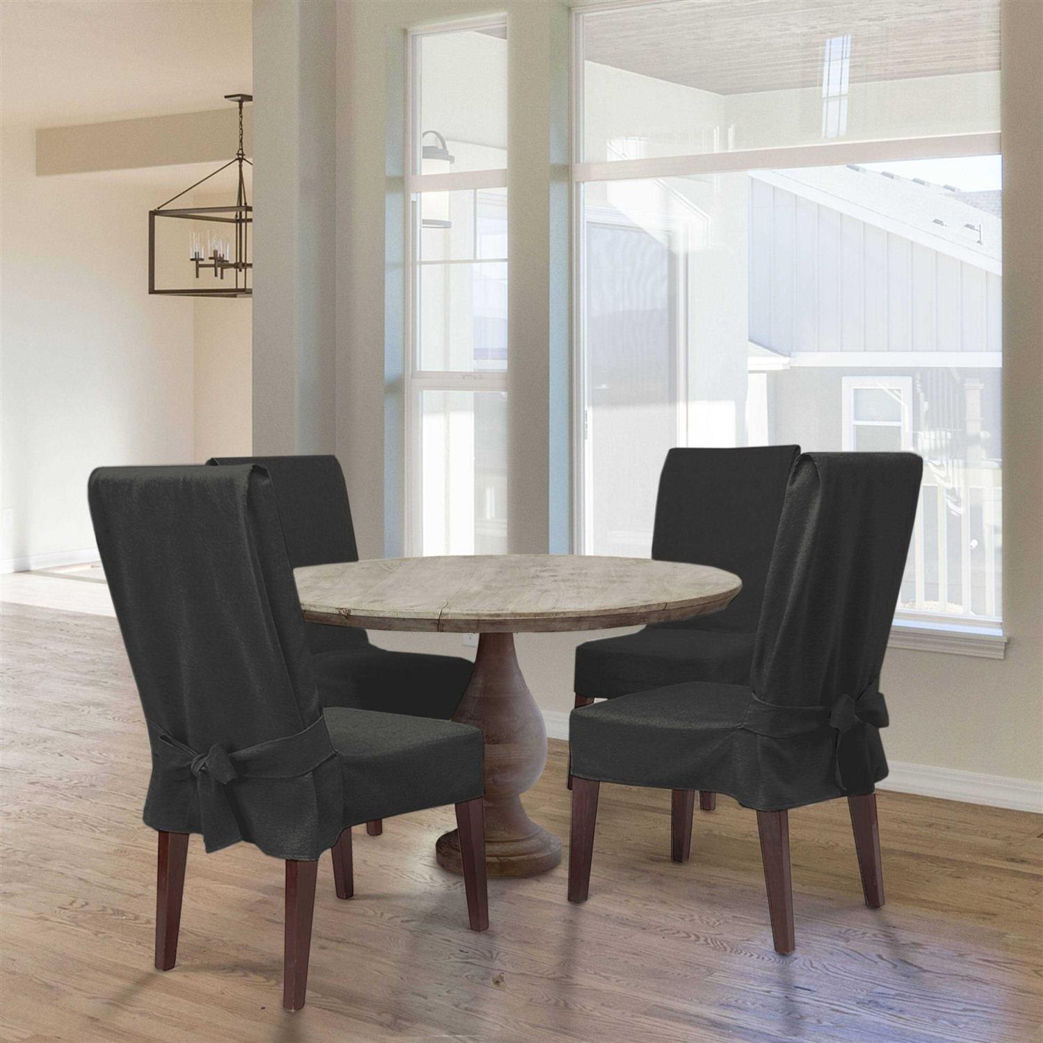 Add a new look and great protection to your dining room chair with the Sure Fit Farmhouse Basketweave slipcover. These slipcovers have front adjustable ties and an elastic band that give a custom fit. The heathered faux linen farmhouse look complements modern, contemporary and rustic decor. 100 percent polyester and machine washable.