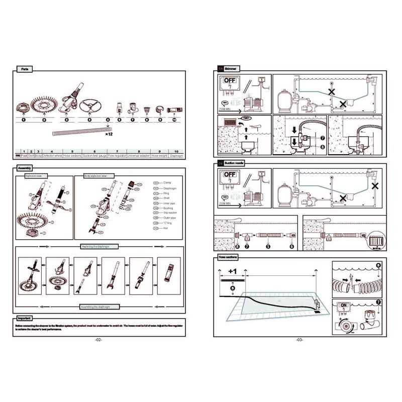 Dependable Service and Efficient Cleaning A reliable vacuum with a long service life. Minimal maintenance is required, as the superior long life diaphragm membrane is the only moving part, and it can easily be reached for routine maintenance or to clean out any oversized debris. There’s no need for costly replacement or repair of flappers, gears and wheels that other types of vacuums may require. Removes debris quickly and easily, even with a low-speed or lower powered pump, as it only requires a 1/3 HP pump or a minimum flow of 8 meters cubed/hour to operate. Durable and efficient pool vacuum cleaning system that thoroughly cleans your entire pool, as it quickly removes debris as it moves across floors, climbs up walls and over steps without getting stuck. Vacuum moves in a random pattern and has a deflector wheel that helps it move around tight corners and also prevents it from getting caught on steps, corners and ladders. Includes 35 feet of premium spiral wound vacuum hose (14 – 2.5 feet hose sections). The hose sections allow you to customize the hose length to the requirements of your pool.