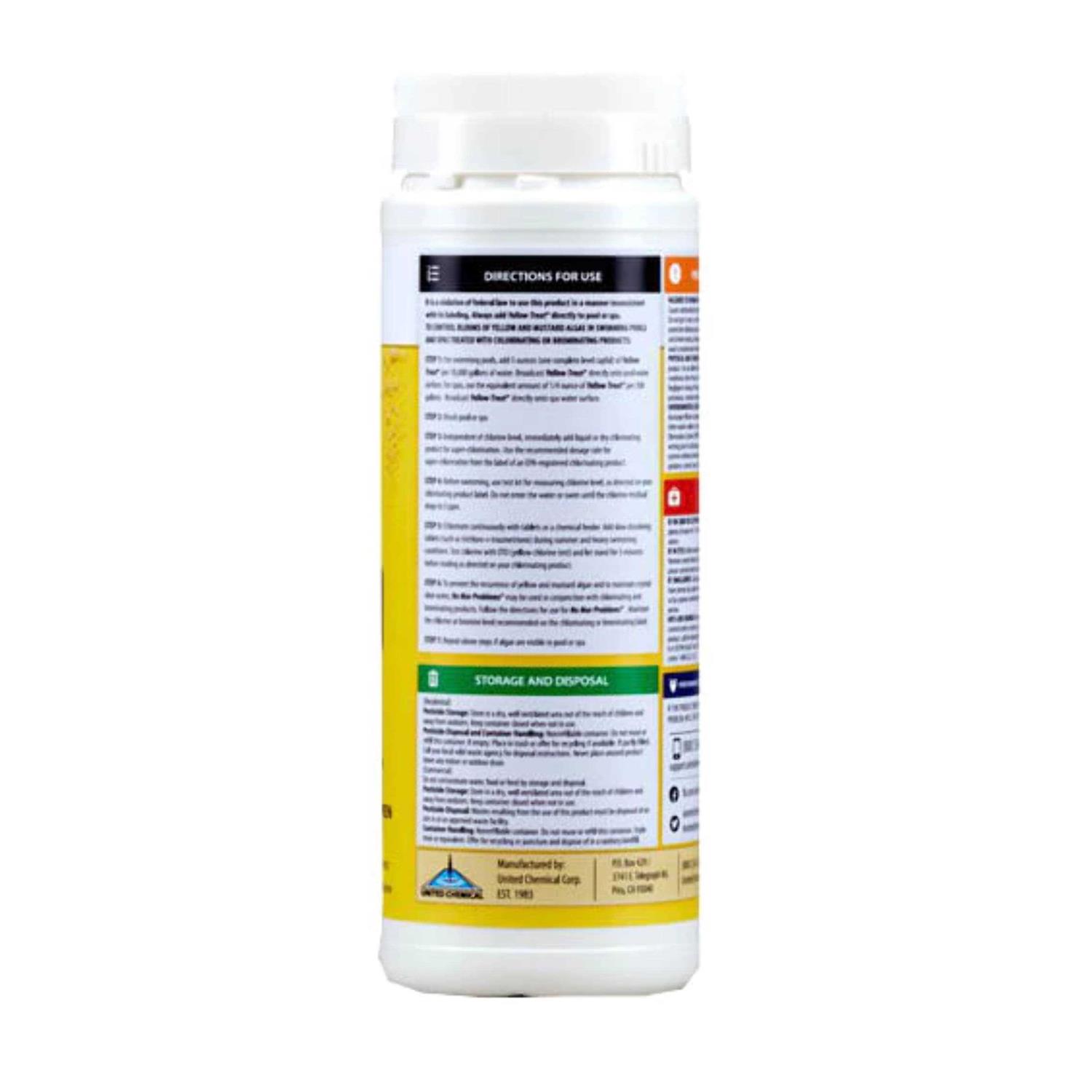 Quick Overview Yellow Treat makes killing mustard algae fast and easy. Just add 5 ounces per 10,000 gallons, brush, and shock. Then wake up the next day to an algae-free pool that still has a chlorine reading. Yellow Treat contains ChlorineBoost, the patented formula of ingredients that supercharges its algae killing ability while stabilizing chlorine readings. Always add Yellow Treat directly to the pool or spa. For swimming pools, add 5 ounces (one level capful) of Yellow Treat per 10,000 gallons by broadcasting directly onto the pool water surface. For spas, add the equivalent of 1/4 ounce per 500 gallons by broadcasting directly onto the spa water surface. Directions For swimming pools, add 5 ounces (one level capful) of Yellow Treat per 10,000 gallons by broadcasting directly onto pool water surface. For spas, add the equivalent of 1/4 ounce per 500 gallons by broadcasting directly onto pool water surface. Brush pool or spa. Independent of chlorine level, immediately add liquid or dry chlorinating product for super-chlorination. Use the recommended dosage rate for superchlorination from an EPA registered chlorinating product. Before swimming, use test kit for measuring chlorine level, as directed on your chlorinating product label. Do not enter the water or swim until the chlorine residual drops to 3 ppm. To prevent the reoccurrence of yellow and mustard algae and maintain crystal clear water, No Mor Problems may be used in conjunction with chlorinating and brominating products. Follow the directions for use for No Mor Problems and maintain the chlorine or bromine level recommended on your chlorinating or brominating product.
