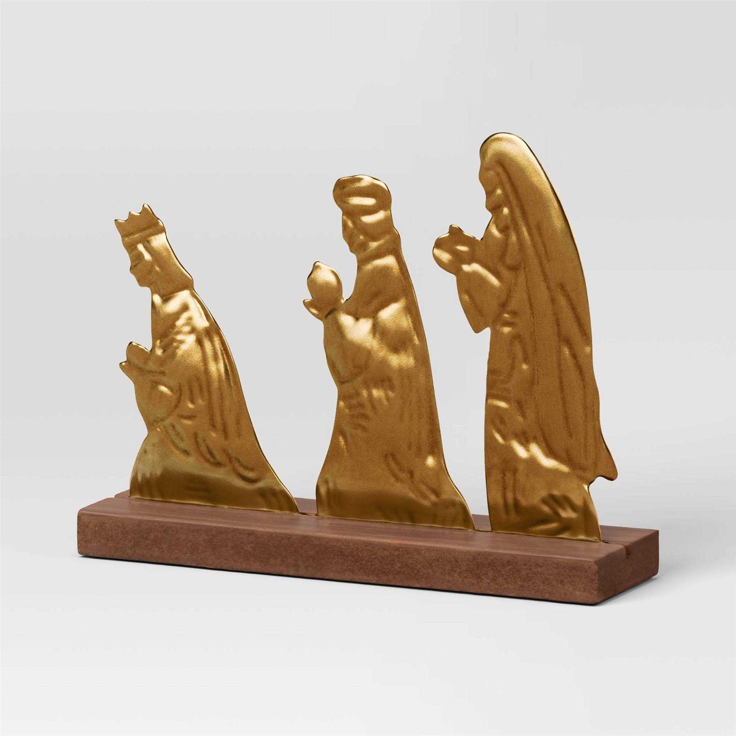 The decorative nativity scene set includes three pieces of brown rectangular bases with different gold-finish metal figurines on them — one with the Holy family, the second with the three Magi and the third with a shepherd and animals. These pieces can be arranged to retell the holy story, and they stand out gorgeously in gleaming gold. Place it beneath the holiday tree, on the mantle, or use it as part of a larger holiday decoration. Welcome to the Wondershop .