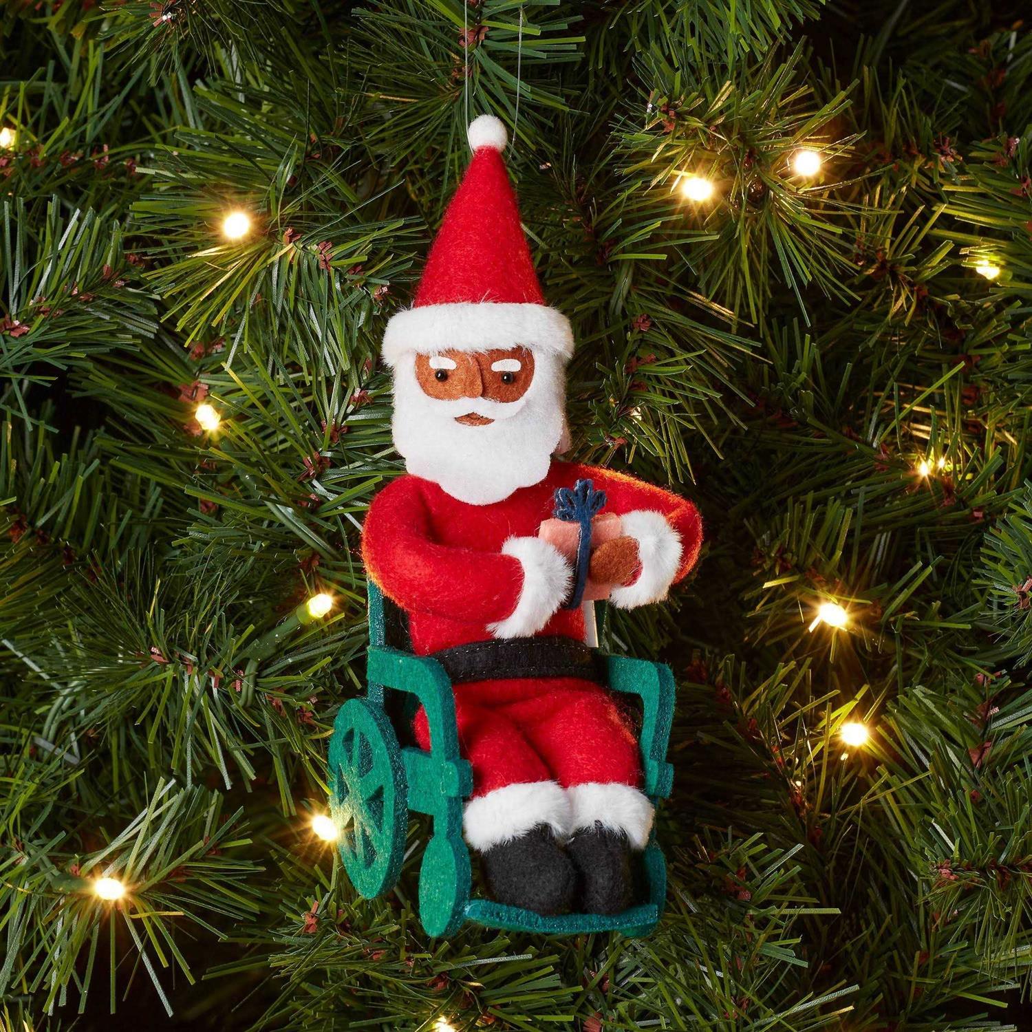 Add a joyful touch to this year’s tree with this Santa in Wheelchair Holding Gift Fabric Christmas Tree Ornament from Wondershop . This cute fabric ornament is designed as Santa Claus sitting in a green wheelchair wearing a classic red jacket with white cuffs, black boots and a red hat and holding an orange gift box in his hands. Great for pairing with a variety of other ornaments, it features an attached loop for easy hanging from the branches of your tree. Welcome to the Wondershop .